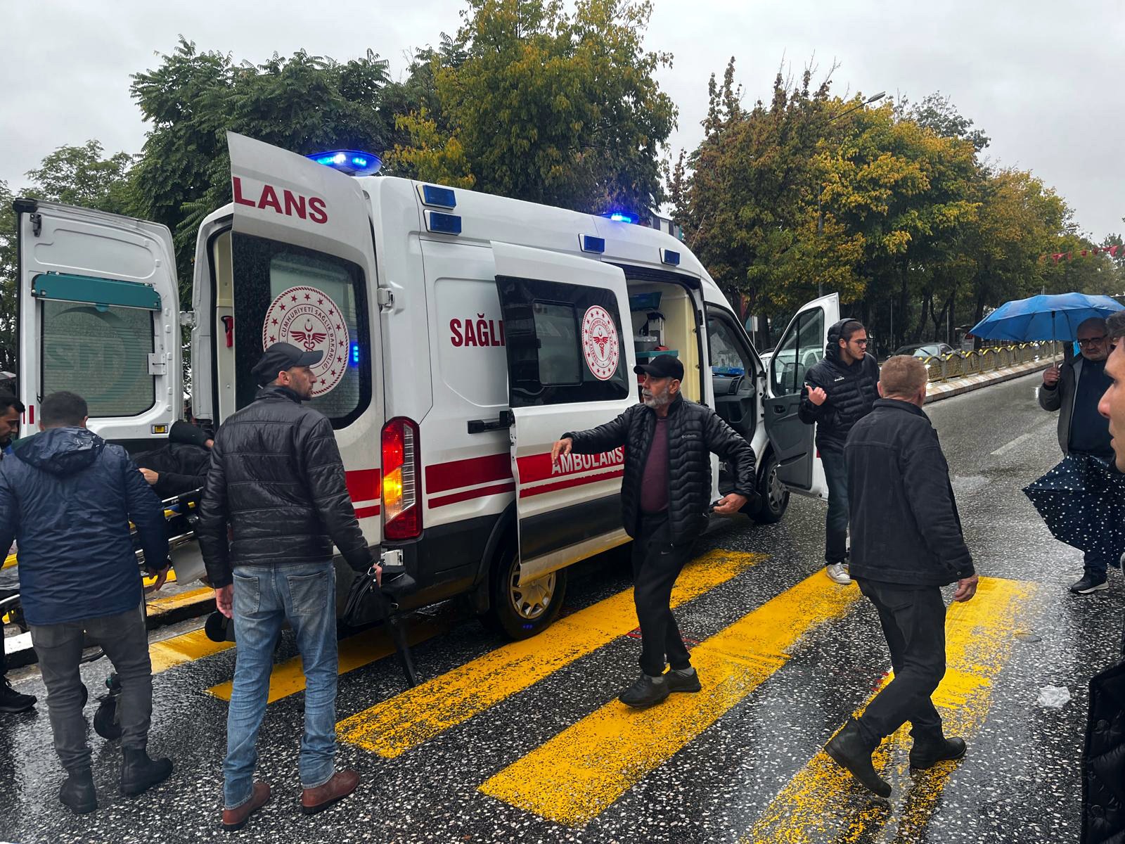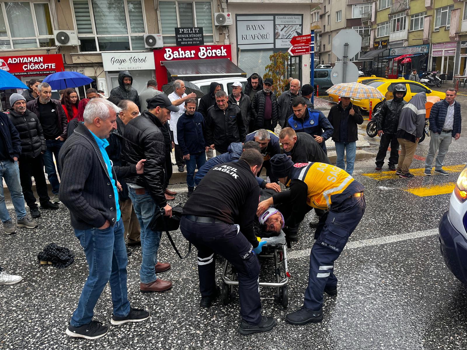 Kuvvetli yağmurun altında yaşanan kazanın ardından, çevredeki esnaf tereddüt etmeden yardıma koştu. Kimi elindeki şemsiyeyi açtı, kimi montunu çıkarıp yaralı kadının üzerine örttü. Yağmur dinmedi ama insanlık bu kez sırılsıklam olmadı.