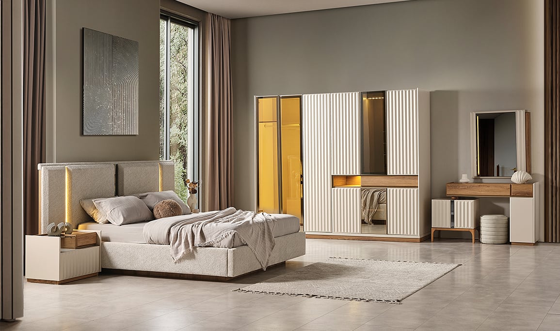 Medusa Home yatak odası koleksiyonu, farklı tarzlarda dekorasyon seçeneklerini bir araya getiriyor. Modern çizgilere sahip minimal tasarımlar, ferah ve düzenli bir atmosfer sunarken; klasik detaylarla zenginleştirilmiş mobilyalar, ihtişamlı bir hava yaratır.