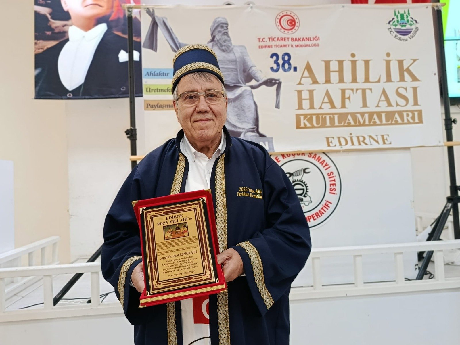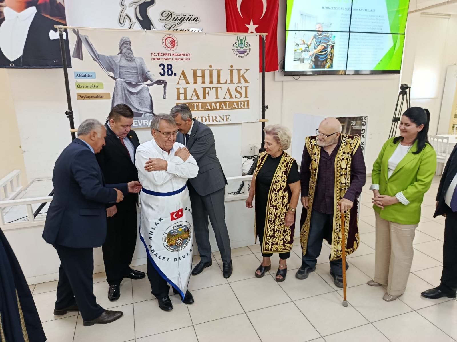 Edirne’de 38’inci Ahilik Haftası kutlama etkinlikleri kapsamında, kentteki bir düğün salonunda geleneksel şed kuşanma töreni düzenlendi. Törene Edirne Valisi Yunus Sezer, Edirne Belediye Başkanı Filiz Gencan, Ticaret İl Müdür Vekili Mustafa Kurt, Edirne Esnaf ve Sanatkarları Odaları Birliği (EDESOB) Başkan Vekili Selçuk Gül, yılın ahisi seçilen 53 yıllık elektrik ustası Feridun Kemallarlı kurum, kuruluş, oda ve birlik temsilcileri ile çok sayıda esnaf ve öğrenciler katıldı. Kemallarlı’ya şedini, Vali Yunus Sezer ve EDESOB Başkan Vekili Selçuk Gül giydirdi.