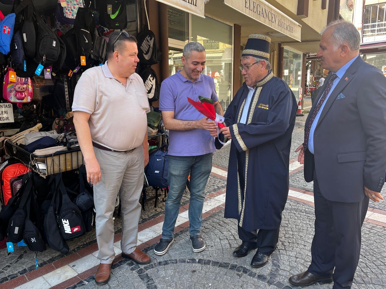 Ülke genelinde devam eden 38’inci Ahilik Haftası kutlamaları kapsamında Edirne’de, yılın ahisi Feridun Kemallarlı beraberinde Ticaret İl Müdürü Mustafa Kurt ve EDESOB Başkanvekili Selçuk Gül ile birlikte esnaf ziyaretinde bulundu. Ziyaretlerinde Vakıf İş Hanı esnafıyla başlayan üçlü, burada çiçek vererek Ahilik Haftası’nı kutladı.