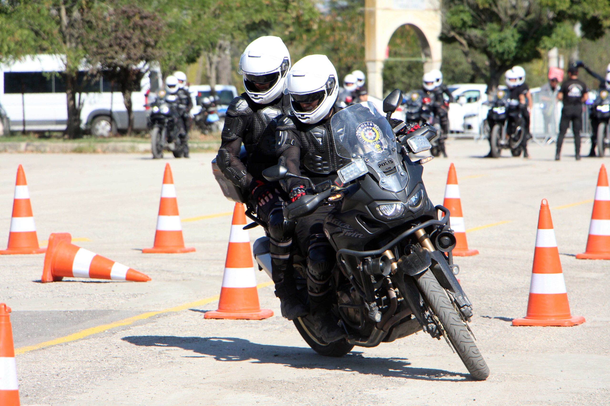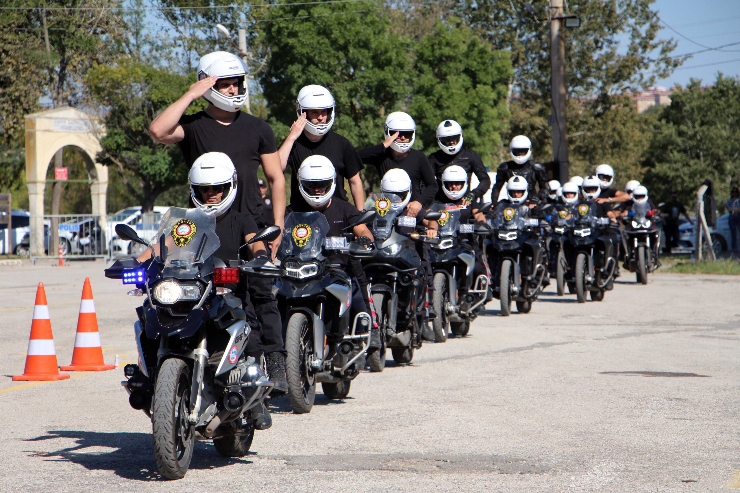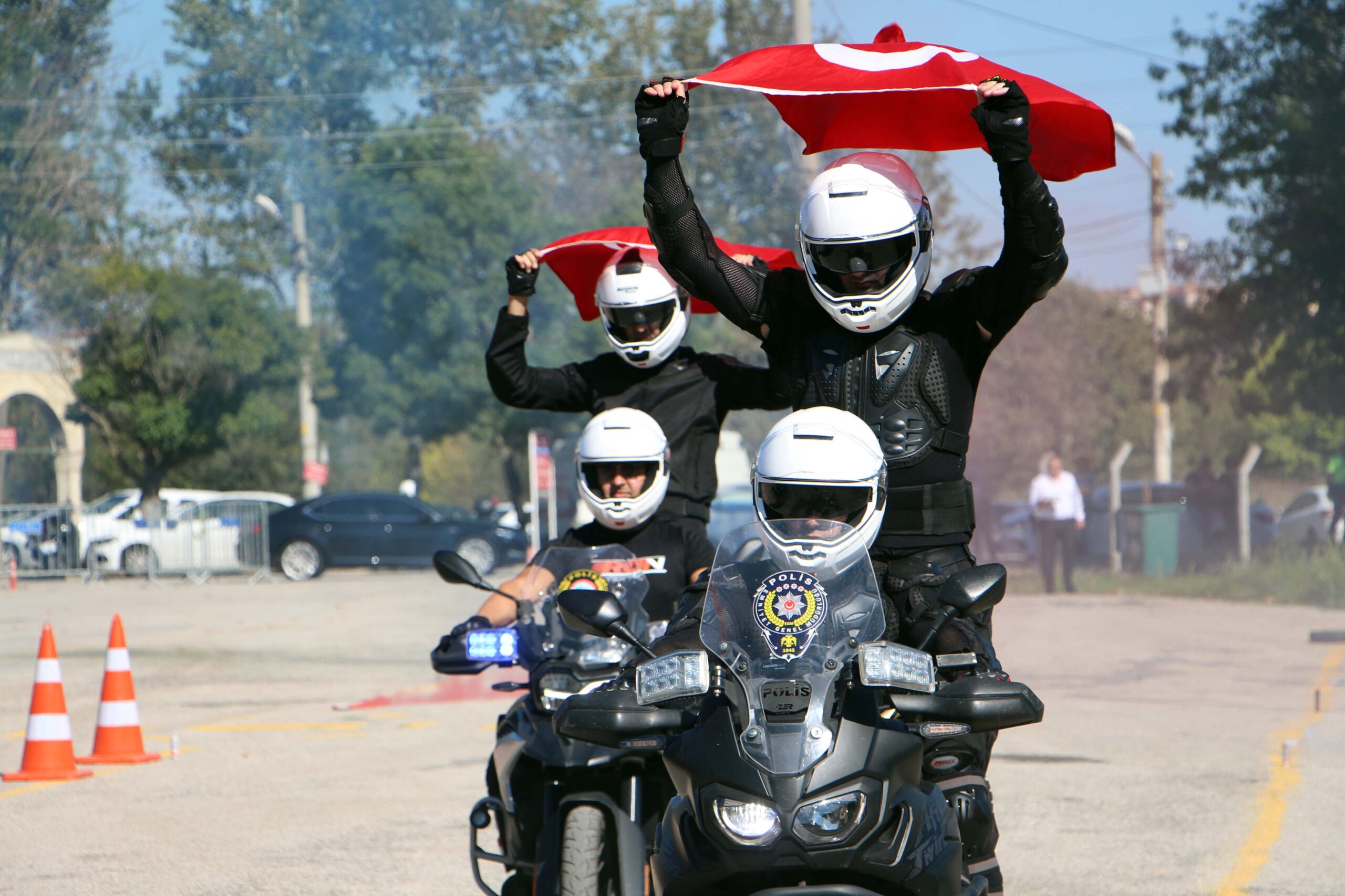Edirne Emniyet Müdürlüğü’nde 5 günlük güvenli sürüş ve geliştirme eğitimi tamamlayan 21 motosikleti polis (Yunus Timi), tarihi Sarayiçi yarımadasında, aldıkları eğitimleri sergiledi.