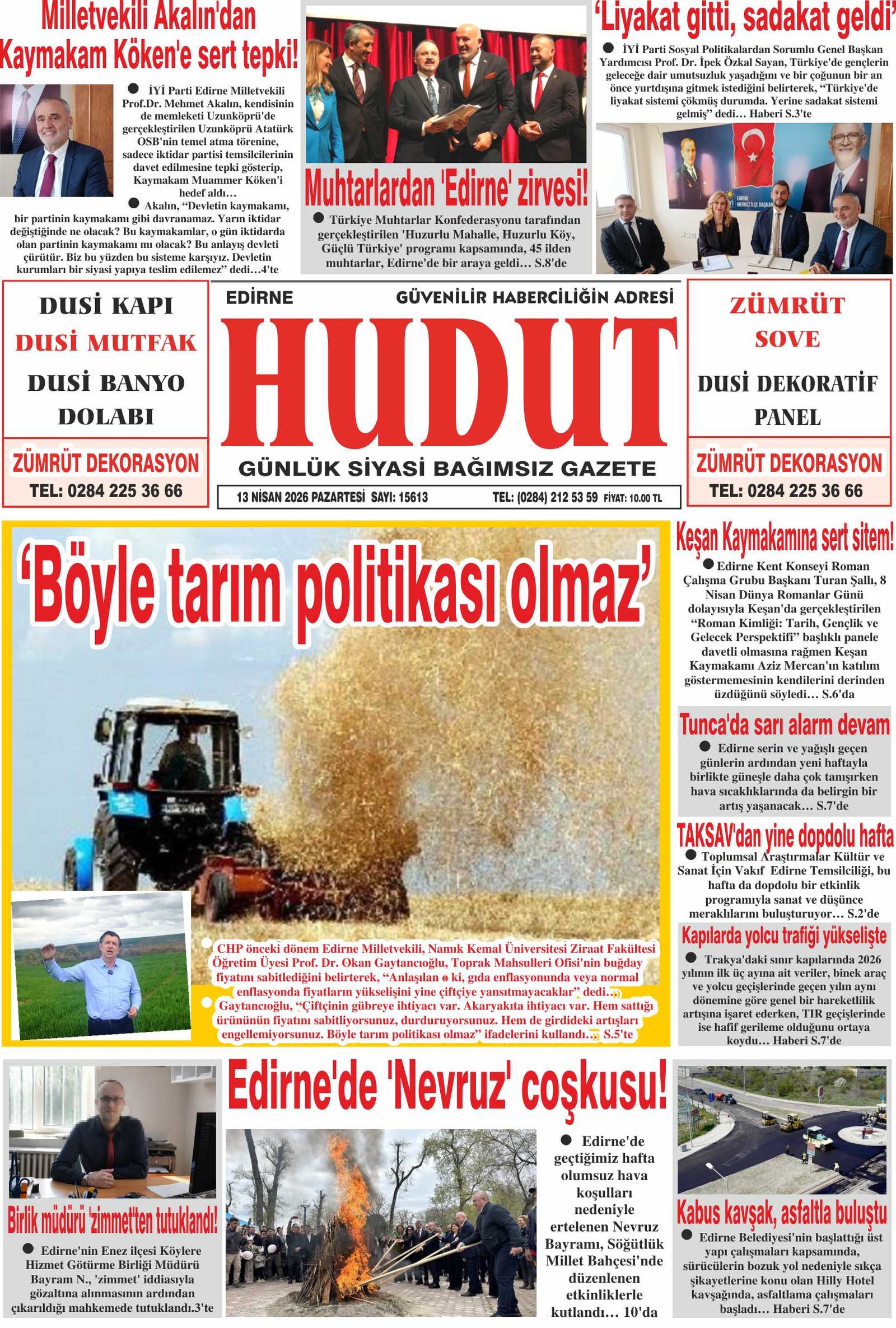 13 Nisan 2026 Pazartesi Hudut Gazetesi