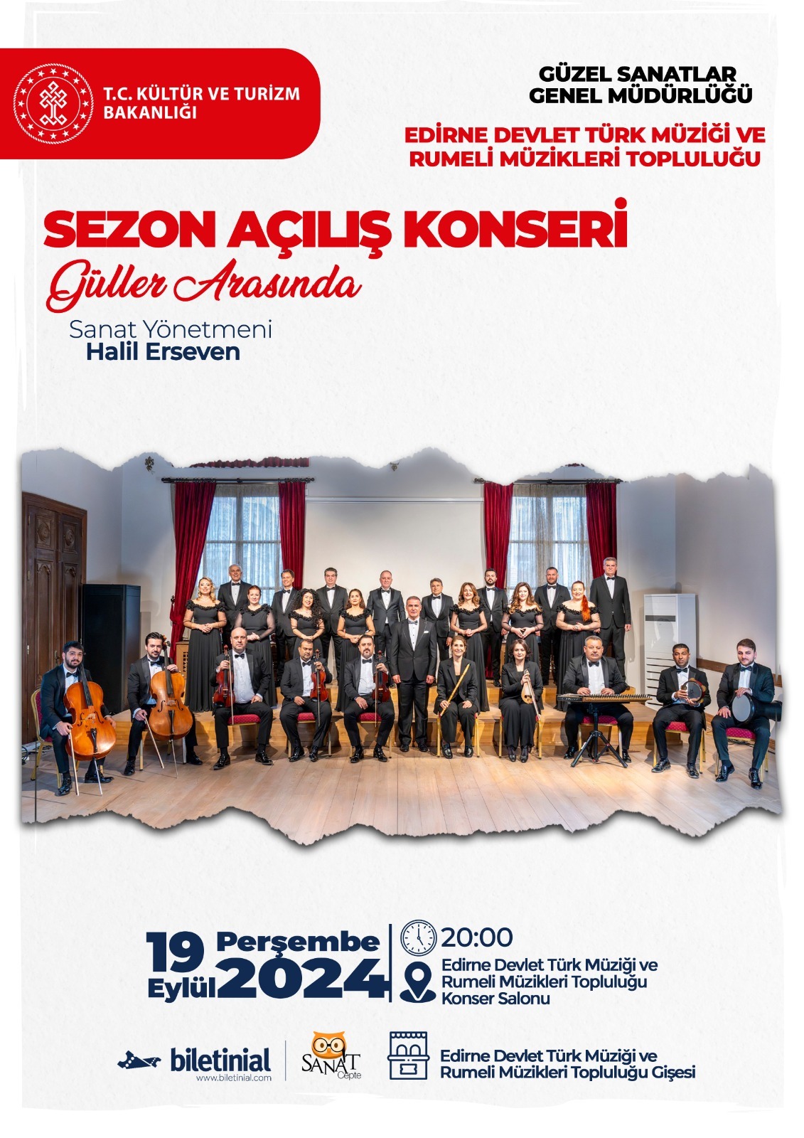 Edirne Devlet Türk Müziği ve Rumeli Müzikleri Topluluğu’nca düzenlenecek “Sezon Açılış Konseri Güller Arasında” 19 Eylül 2024 Perşembe günü akamı gerçekleştirilecek.