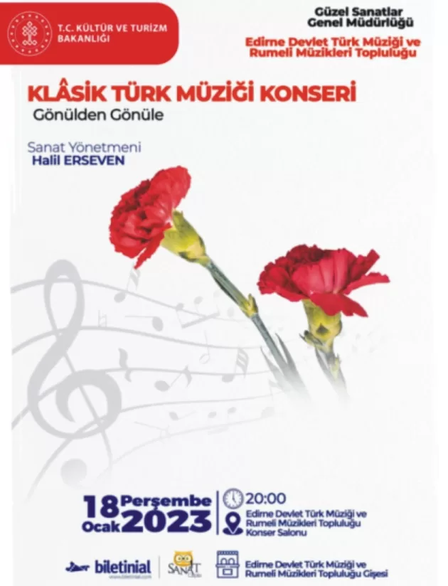 Edirne Devlet Türk Müziği ve Rumeli Müzikleri Topluluğu’nca düzenlenen “Gönülden Gönü-le” Klasik Türk Müziği Kon-seri 18 Ocak 2024 Perşembe günü gerçekleştirilecek.