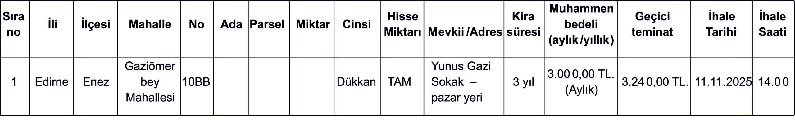 4– İhale Enez Belediye Başkanlığı hizmet binasında 11.11.2025 günü saat 14.00’te 2886 sayılı yasanın 45. maddesi gereği açık artırma teklif usulü ile yapılacaktır.