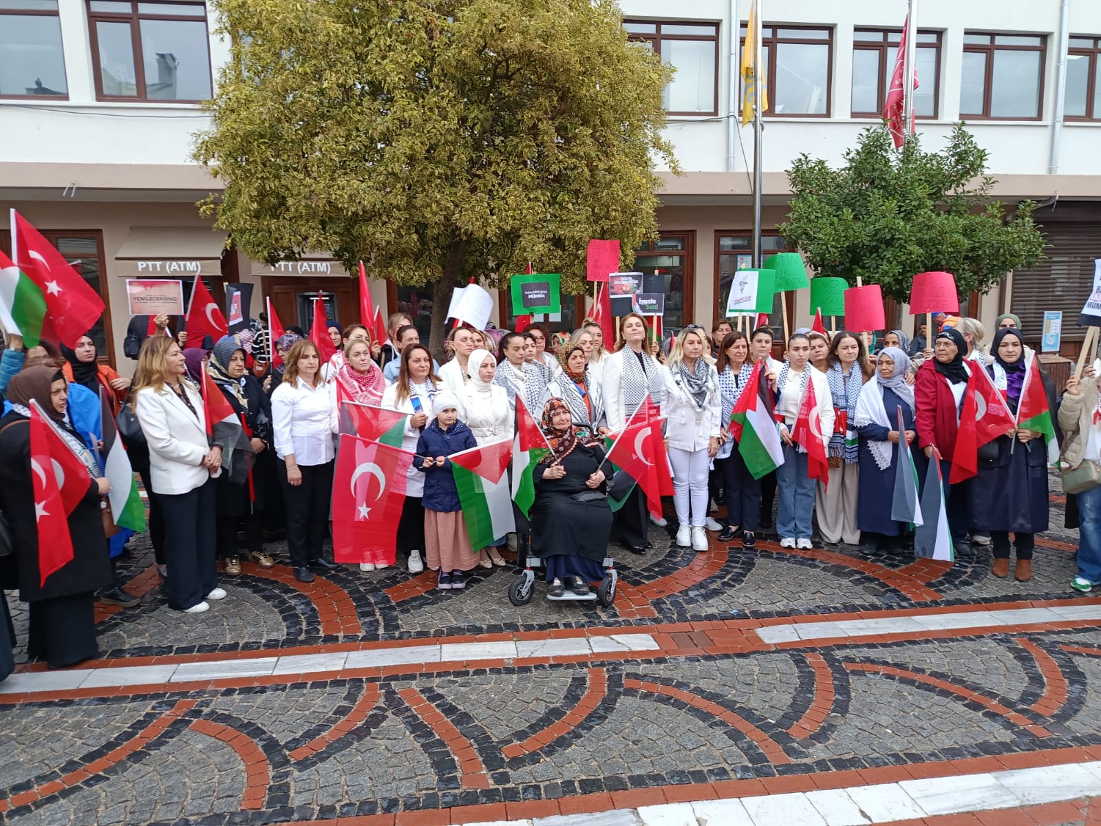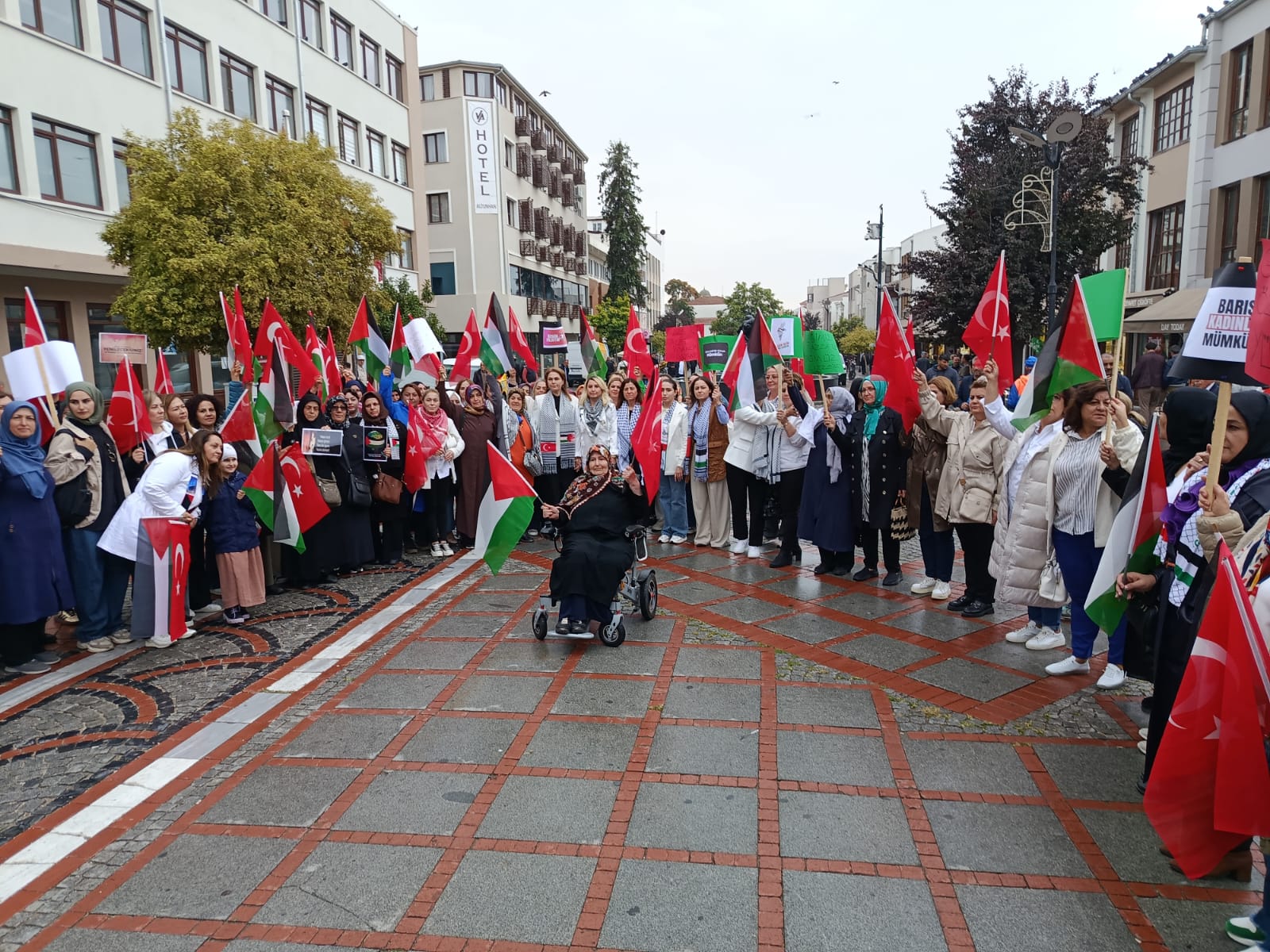 Ve insanlığını kaybetmeyen herkesin zinciridir. Biz; ‘Yaralıları mı kurtaracaktım, şehitleri mi taşıyacaktım ya da bir torba un mu bulmaya çalışacaktım? Yemin ederim eve tek bir torba un getirip, çocuklarımın karnının doyacağını bilsem, ölüme razı olurum’ diyen Gazzeli annenin sesi olmak için, bu sesi dünyaya duyurmak için buradayız. Bu zulmü görmezden gelen herkese soruyorum: Kalbiniz nerede? Yüce Rabbimiz mealen ‘Bir insanı öldüren, bütün insanlığı öldürmüş gibidir. Bir canı yaşatan, bütün insanlığı yaşatmış gibidir.’ (Maide, 32) buyuruyor. Gazze, bu ilahi kelamın sarsıcı bir imtihanıdır. Bizler İstanbul’dan, Hakkari’den, Trabzon’dan, Erzurum’dan ve Türkiye’nin 81 ilinden dünyanın dört bir yanındaki kadınlara, kız kardeşlerimize sesleniyoruz: Barış kadınla mümkün” diye konuştu.