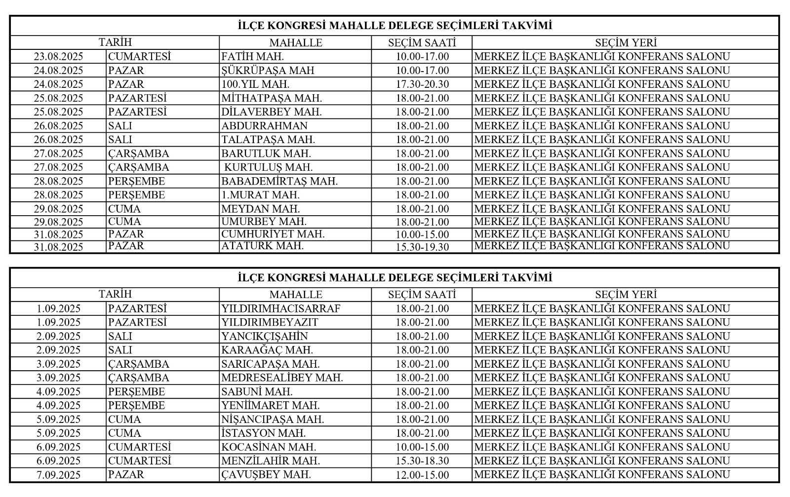 İlçe Kongresi Mahalle Delege Seçimleri Merkez İlçe Başkanlığı Konferans Salonu’nda, Köy Delege Seçimleri de köy kahvehanelerinde gerçekleştirilecek.