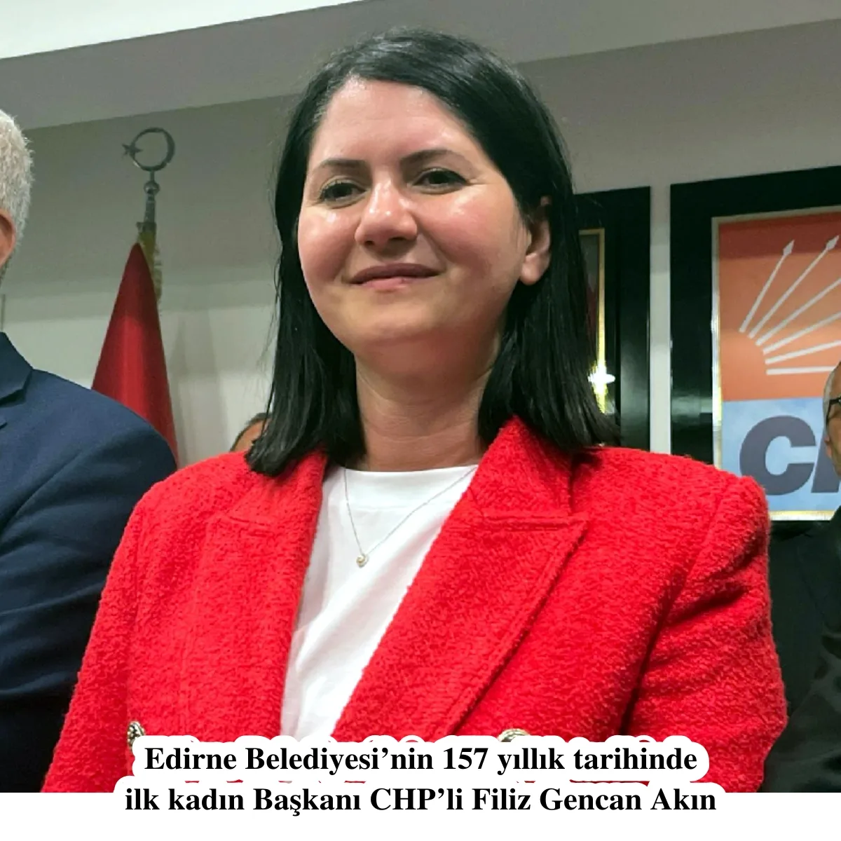 Edirne'nin önümüzdeki 5 yılki belediye başkanı Cumhuriyet Halk Partisi'nin adayı Avukat Filiz Gencan Akın oldu... CHP İl Başkanlığı'nın önünde partili ve vatandaşların meşaleli, davul ve zurnalı, havai fişekli sevinç gösterileriyle zaferini kutladığı Filiz Gencan Akın, Edirne'de ilk kadın belediye başkanı olarak tarihe geçti... CHP Süloğlu, Lalapaşa, Havsa, Keşan ve Enez ilçelerinden zaferle çıkarken, Meriç ve İpsala ilçelerinde AK Parti, Uzunköprü'de ise İYİ Parti kazandı….