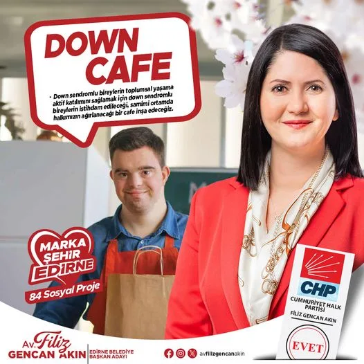 CHP Edirne Belediye Başkan Adayı Avukat Filiz Gencan Akın, “Down Cafe” down sendromlu bireylerin istihdam edileceği, samimi ortamda halkın ağırlanacağı bir cafe inşa edeceklerini açıkladı.