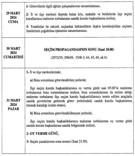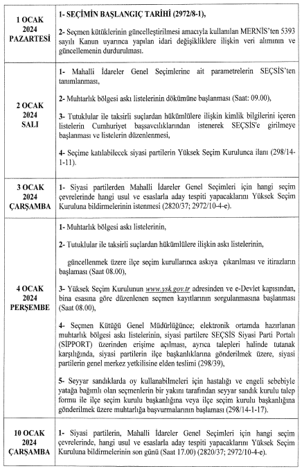 Yüksek Seçim Kurulu 31 Mart 2024 Pazar günü yapılacak yerel seçimlerle ilgili takvimi yayınladı. Seçim takvimi 1 Ocak 2024’te başlayacak. Kesin aday listeleri 20 Şubat’ta teslim edilecek ve kesin aday listeleri 3 Mart Pazar günü ilan edilecek.