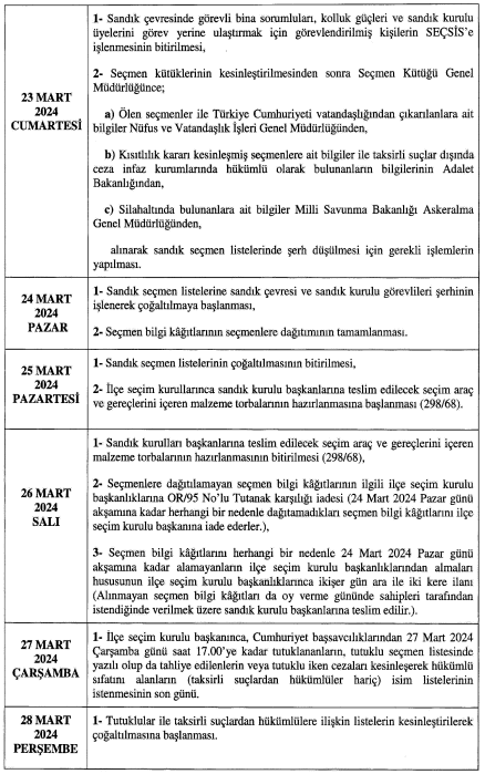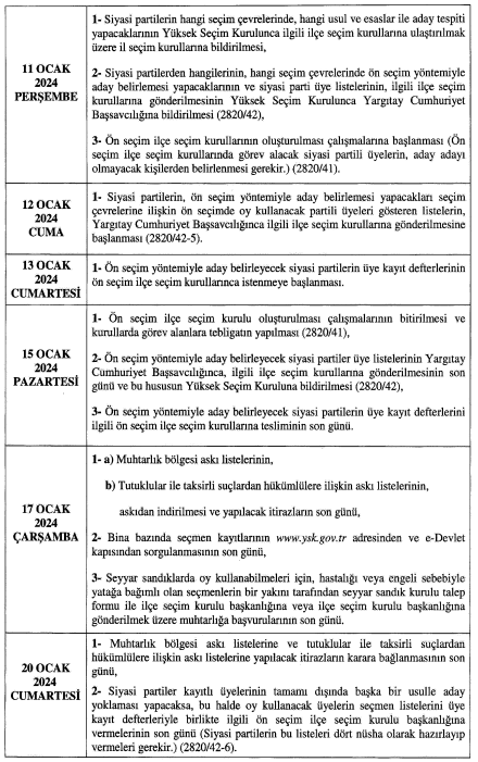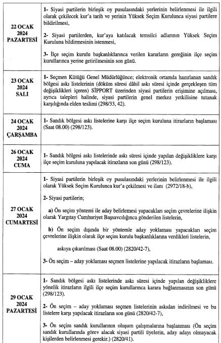 Resmi Gazete’de yayımlanan seçim takvimine göre, seçmen kütüklerinin güncelleştirilmesine kullanılan MERNİS’e veri alımı 1 Ocak’ta durdurulacak. Seçime katılabilecek siyasi partiler 2 Ocak’ta ilan edilecek. Seçmen listeleri 4 Ocak’ta askıya çıkarılacak ve itiraz süesi başlayacak. Listeler 17 Ocak’ta askıdan indirilecek. Siyasi partilerin oy pusulasındaki yerlerinin belirleneceği kura çekimi ise 27 Ocak günü yapılacak. 7 Şubat Çarşamba günü ise seçmen kütüleri kesileşecek seçmenlerin oy vereceği yerler ile sandıkların belirlenmesi işlemlerine başlanacak.