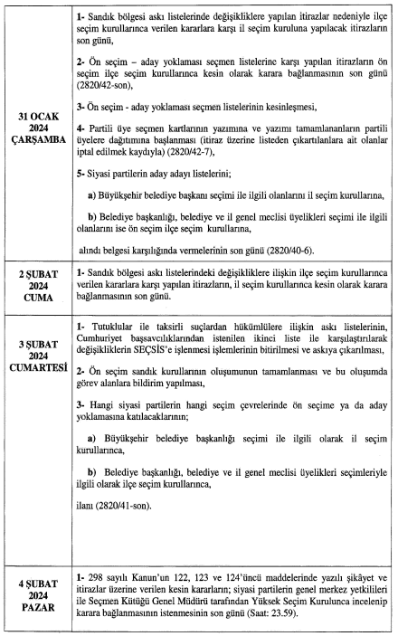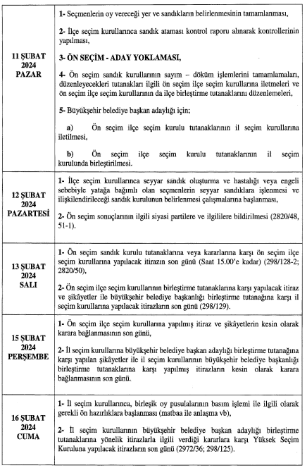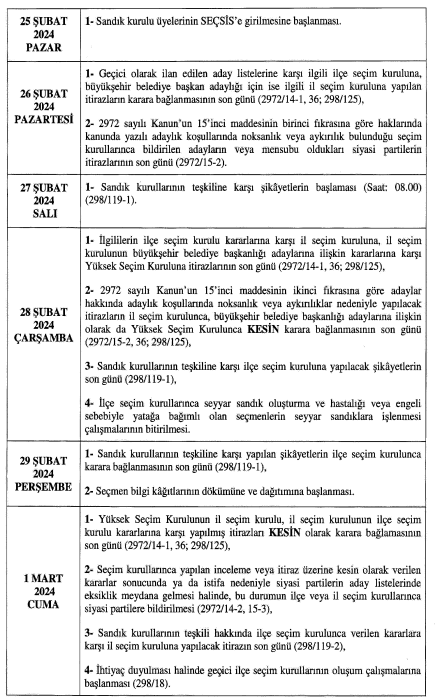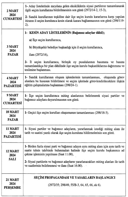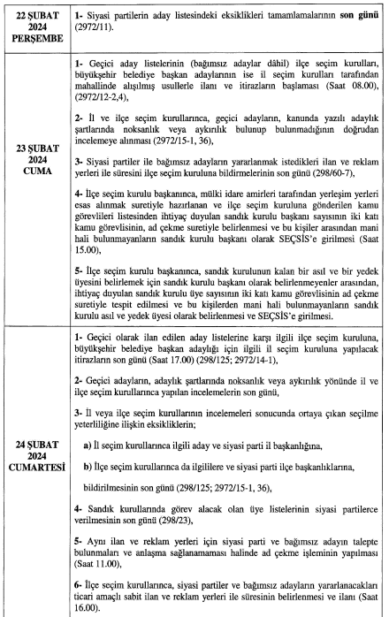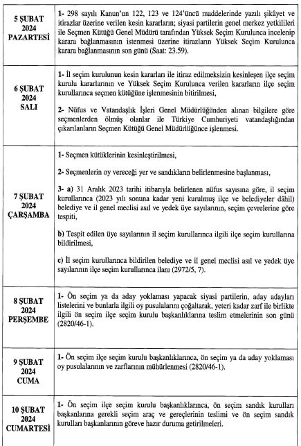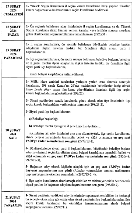 20 Şubat günü ise siyasi partiler belediye başkanlığı, bvelediye ve il genel meclisleri üyeliklerine ait aday listelerini teslim edecekler. Kesina day listelerinin ise 3 Mart ğazar günü il ve ilçe seçim kurullarınca ilan edileceği açıklandı.