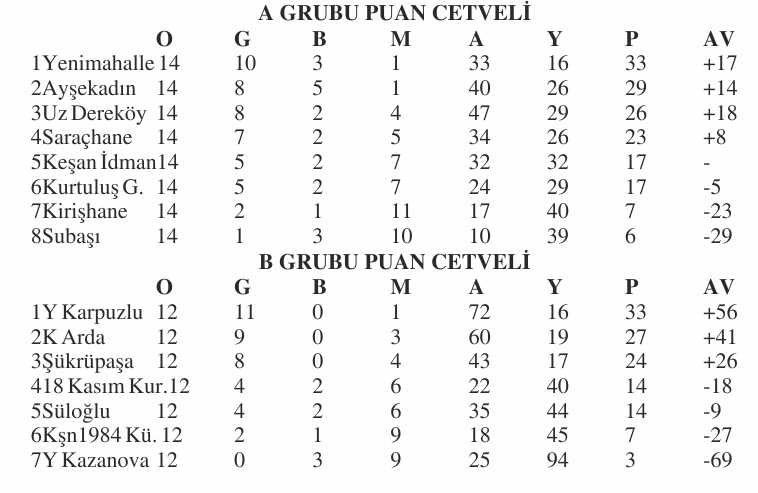 A Grubu’nda Y. Mahalle ve Ayşekadın, B Grubu’nda da Y. Karpuzlu ve K. Arda’nın sezonu ilk iki sırada tamamlayarak Süper Amatör’e yükseldiği ligde son hafta adeta gol düellosu yaşandı. 7 maçta fileler tam 55 kez havalanırken Y.Kazanova – Süloğlu arasındaki mücadele 7-16 sona erdi.