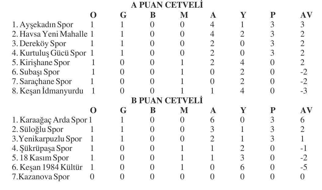 1’inci Amatör Lig’de ilk hafta 7 karılaşmadan 4’ü Saraçhane, diğer 3’ü ise Subaşı, Keşan ve Uzunköprü’de oynanırken, ligin ilk haftasında 7 takımlı B Grubu’nda yer alan Kazanova Spor Kulübü bay geçti.