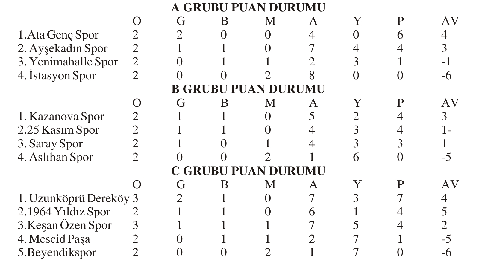 Aslıhan Spor 0-3 Kazanova Spor 25 Kasım Spor 2-1 Saray Spor