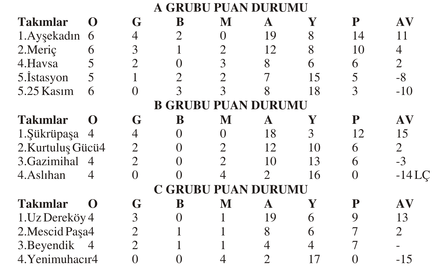B Grubu lideri Şükrüpaşa 4’te 4 yaparak puan kayıpsız olarak yoluna devam ederek grup birinciliğini garantiledi. C Grubu lideri Uz. Demirköy ilk mağlubiyetini Beyendik karşısında alırken. A Grubu’nda ise Ayşekadın liderliğini sürdürüyor.