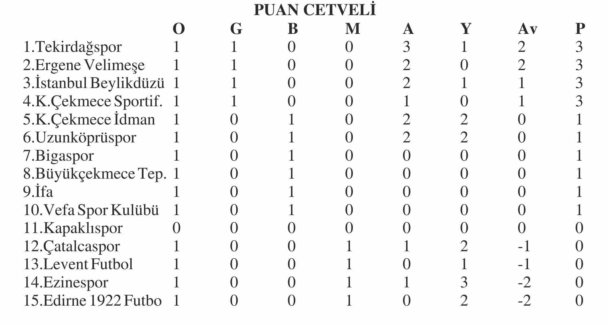 Edirne 1922 Futbol Kulübü Bölgesel Amatör Ligi’nde (BAL) evindeki ilk maçında yarın Bigaspor’u konuk ederken, Uzunköprüspor da sezonun ilk deplasman maçında aynı gün Küçükçekmece Sportif Faaliyetleri San.Tic.A.Ş. ile karşı karşıya gelecek