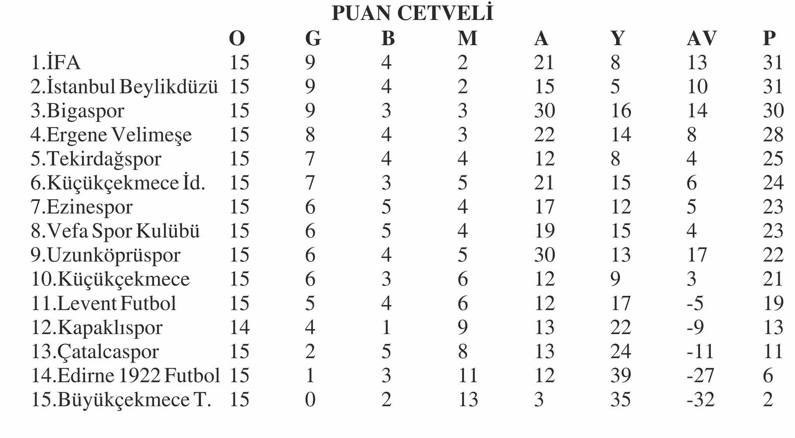 15. HAFTA TOPLU SONUÇLAR