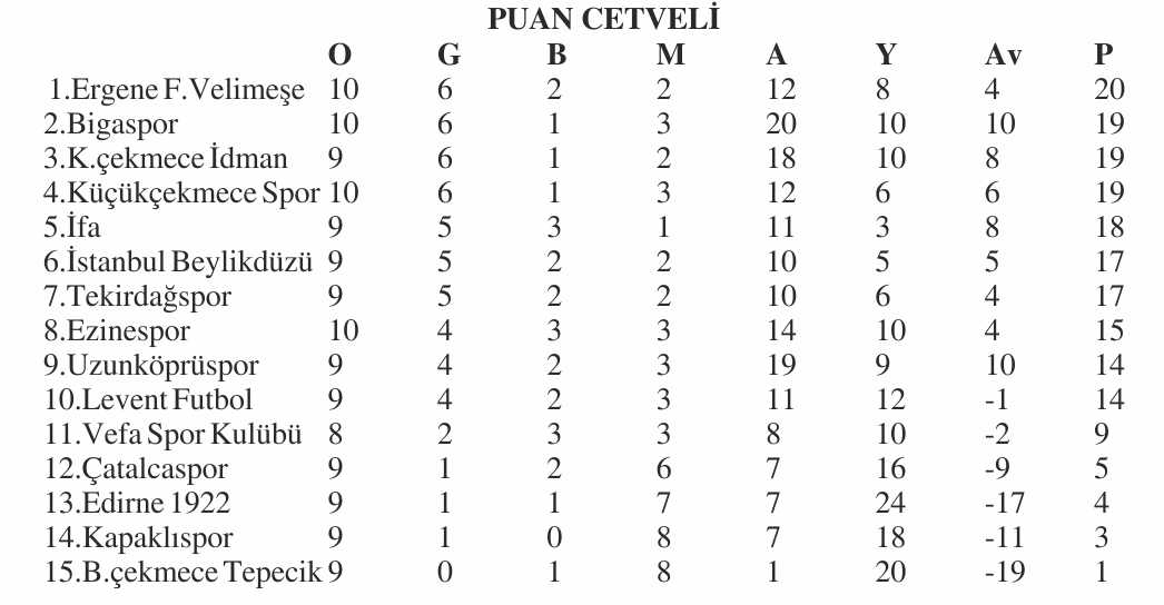 4 puanla 13’üncü sıradaki Edirne 1922 Futbol Spor Kulübü, 10 Aralık Çarşamba günü oynanacak ligin 11. haftasında Tekirdağspor’u konuk ederken, 14 puanla 9. sıradaki Uzunköprüspor ise ise deplasmanda Kapaklıspor ile karşı karşıya gelecek.