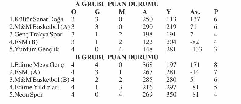B Grubu’nda Edirne Mega Genç Spor ve FSM. (A) ilk iki sırada yer alarak finallere uzanan yolu yakalamayı başarırken, A Grubu’ndaki iki takım Kültür Sanat Doğa – M&M Basketbol (A) arasındaki bugün oynanacak karşılaşma puan cetvelinin zirvesini yakından ilgilendirdiği için büyük önem taşıyor…