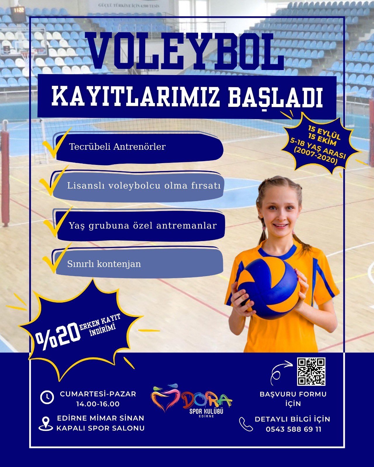 Edirne’nin aktif spor kulüplerinden Dora Spor Kulübü, voleybol branşında yeni dönem kayıtlarını başlattı. 15 Ekim tarihine kadar yapılacak kayıtlar, 5 – 18 yaş arası (2007 – 2020 doğumlu) çocuk ve gençleri kapsıyor.