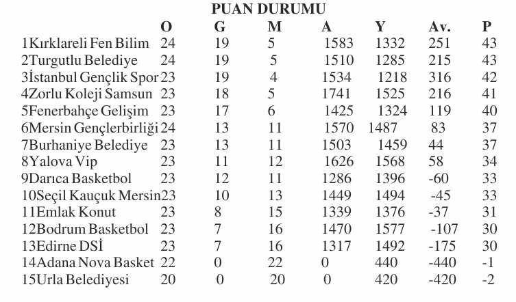Seçil Kauçuk Mersin Basketball takımı Adana Nova Basketbol, Darıca Basketbol Feneri de Urla Belediyesi’nin ligde çekilmeleri sebebiyle Edirne DSİ gibi haftayı maç yapmadan geçirdikleri TKBL’nin 25. haftası 5 maçla geride kaldı. Kırklareli Belediyesi Kırklareli Fen Bilimleri, Yalova Vip’i deplasmanda yenerek liderliğini sürdürdü.