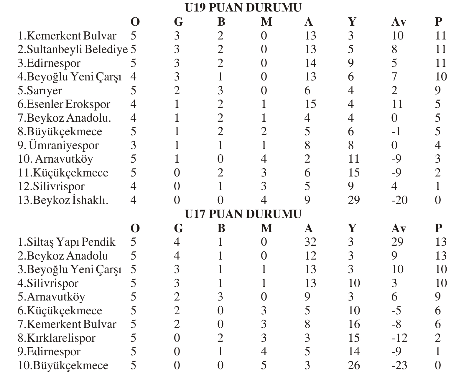 U19 1. GRUP 5. HAFTA TOPLU SONUÇLAR