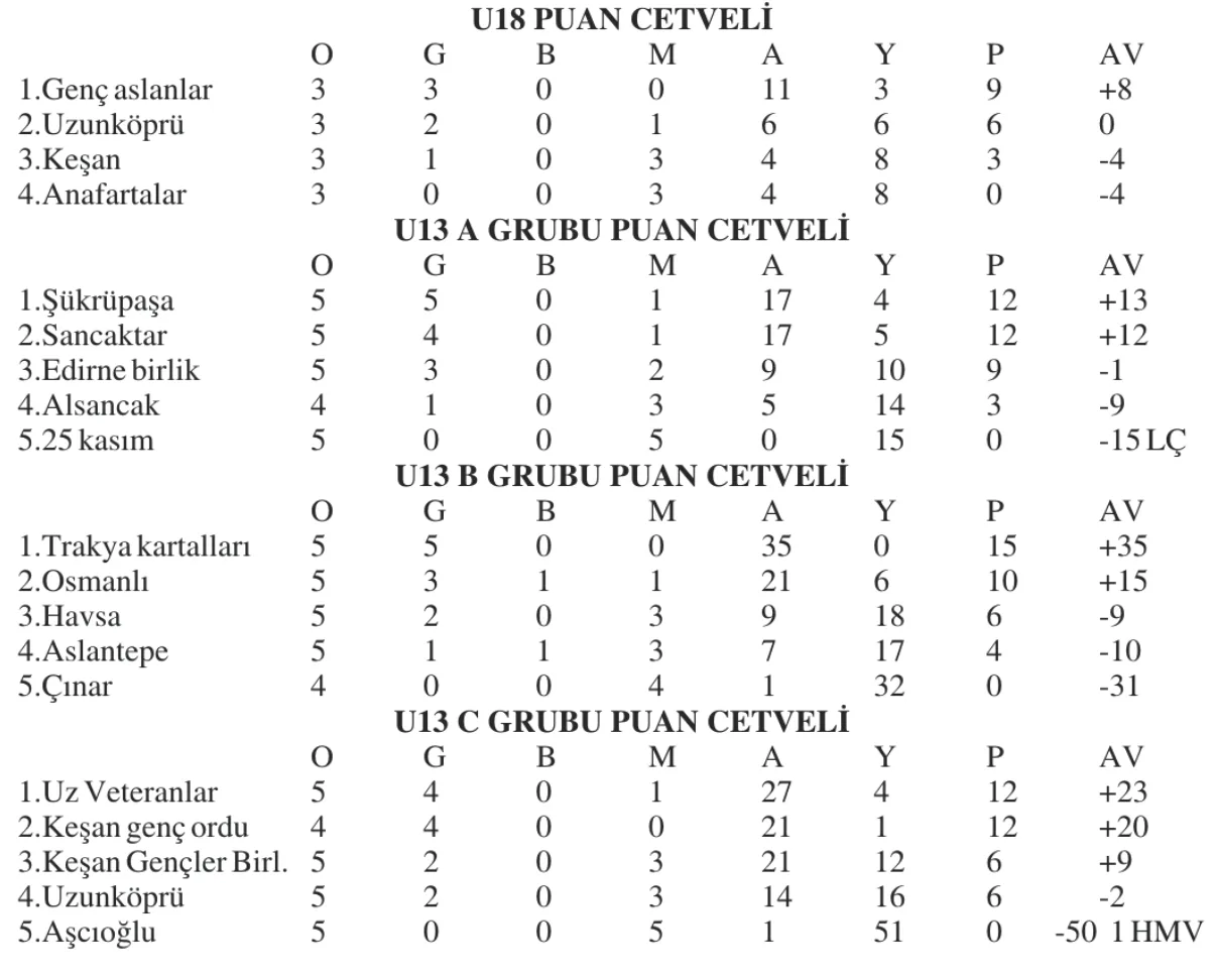 Uz Veteranlar 17-0 Aşçıoğlu Uzunköprü 3-2 Keşan Gençler Birliği