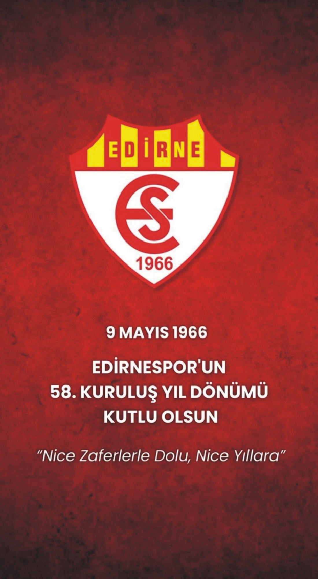 Gelecek yıl dönümlerinde daha nice zaferleri birlikte kutlayabilmek umuduyla, Edirnespor’un 58. kuruluş yıl dönümünü kutluyor, herkese sevgi ve saygılarımızı sunuyoruz. Nice yıllara, nice zaferlere!”