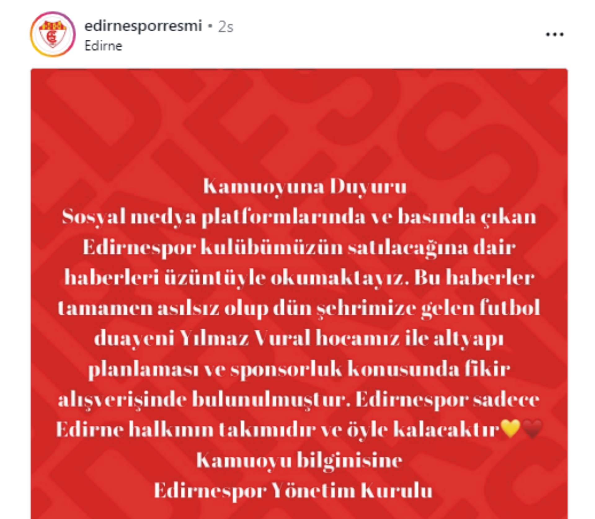 Yılmaz Vural ile sadece altyapı planlaması ve sponsorluk konusunda fikir alışverişinde bulunulduğu belirtilen açıklamada, “Sosyal medya platformlarında ve basında çıkan Edirnespor kulübümüzün satılacağına dair haberleri üzüntüyle okumaktayız. Bu haberler tamamen asılsız olup, dün şehrimize gelen futbol duayeni Yılmaz Vural hocamız ile altyapı planlaması ve sponsorluk konusunda fikir alışverişinde bulunulmuştur. Edirnespor, sadece Edirne halkının takımıdır ve öyle kalacaktır” denildi.