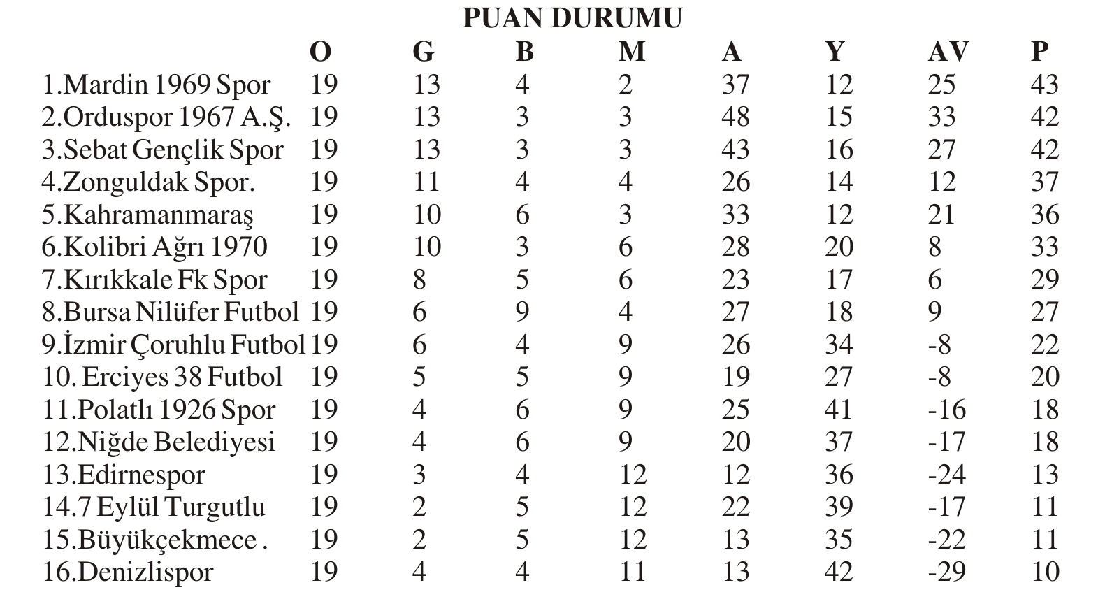 TFF 3. LİG 4. GRUP 19. HAFTA TOPLU SONUÇLAR
