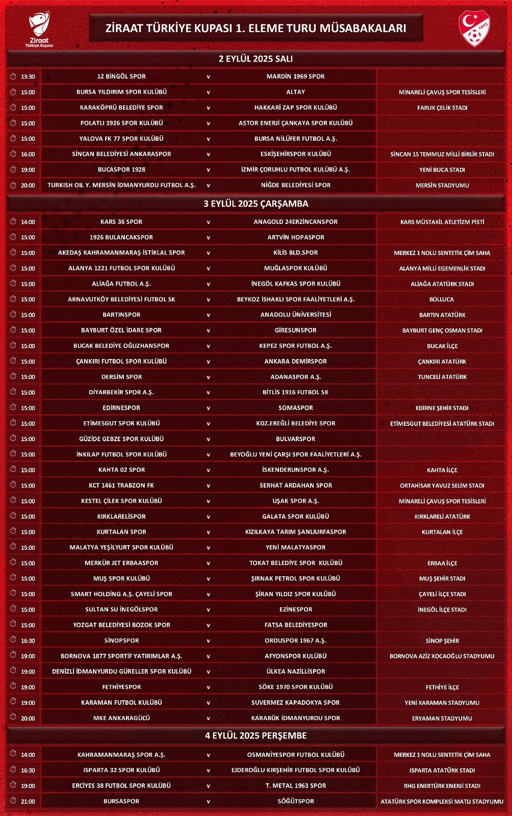 Ziraat Türkiye Kupası 1. Eleme Turu müsabakalarından 8’i 2 Eylül 2025 Salı, Edirnespor – Somaspor dahil 33’ü 3 Eylül Çarşamba ve 4’ü ise 4 Eylül 2025 Perşembe günü oynanacak. Böylelikle 3 günde toplam 45 karşılaşma yapılacak.
