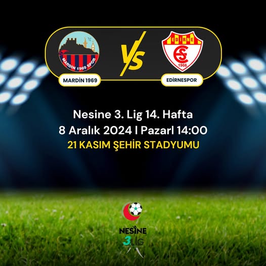 Nesine 3. Lig 4 Grupta 14. hafta karşılaşmaları 7 ve 8 Aralık 2024 tarihlerinde oynanacak. Edirnespor 8 Aralık Pazar günü saat 14.00’te deplasmanda grup lideri Mardin 1969 Spor’a konuk olacak.