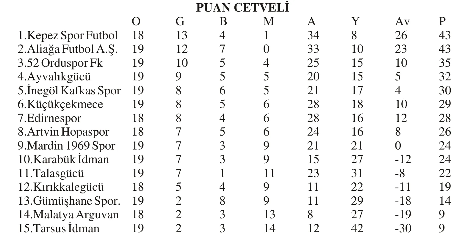 Edirnespor’un bay geçtiği TFF 3.Lig 1. Grup’ta 20. hafta 18 golle geride kaldı. Maçı olmayan Edirnespor bundan dolayı 6’ncı basamaktan 7’inci sıraya inerken, lider Kepez Spor Futbol A.Ş.’nin berabere kalması sonucu Aliağa Futbol A.Ş. ile puanları 43’te eşitlenmiş oldu.