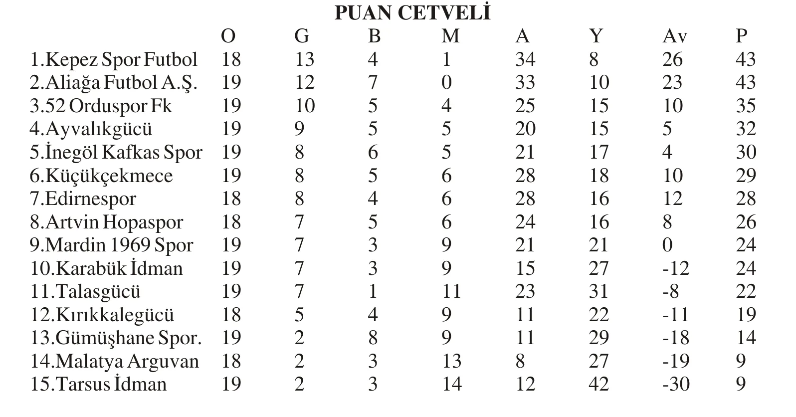 TFF 3. LİG 1. GRUP 20. HAFTA TOPLU SONUÇLAR