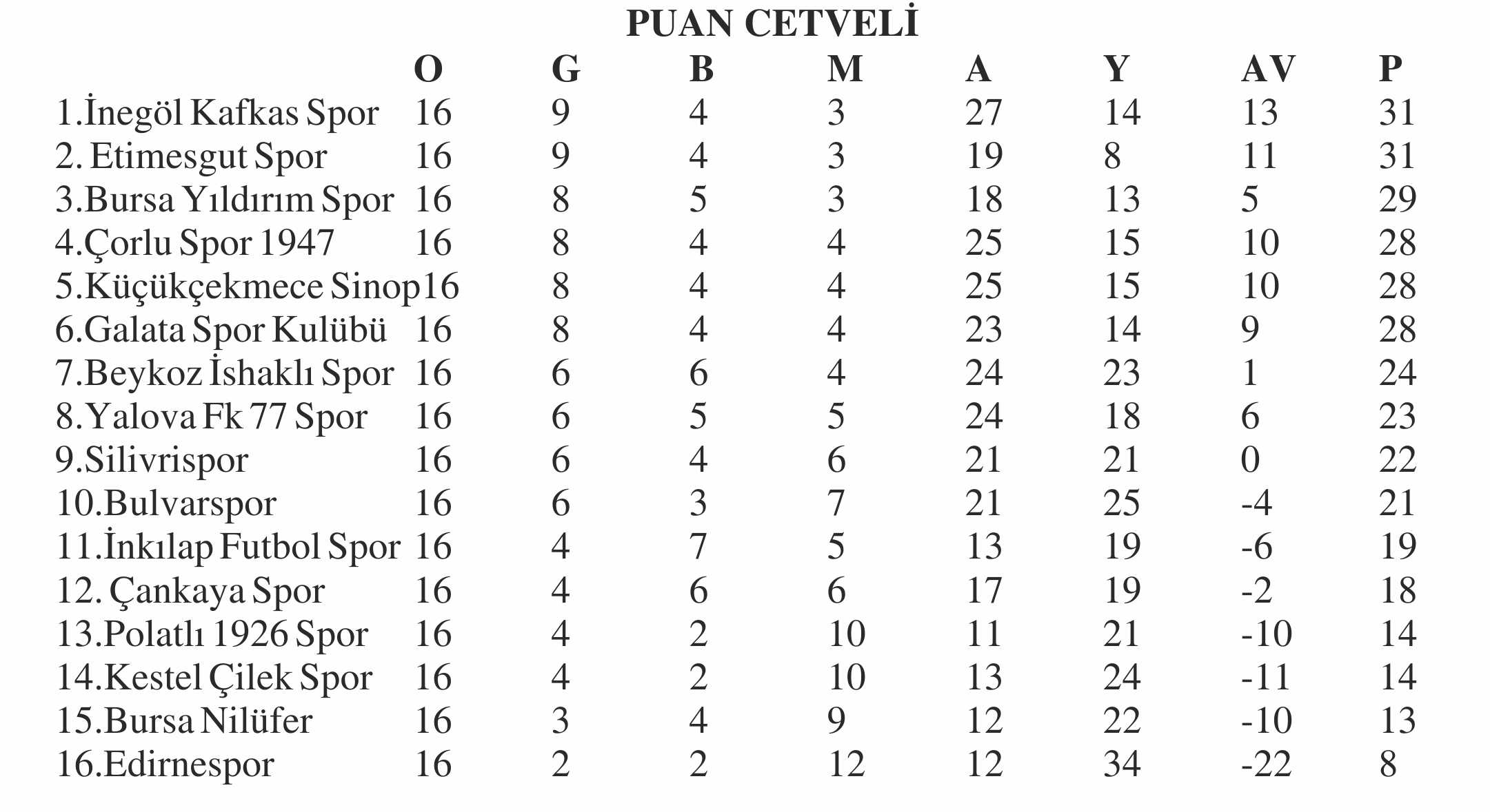 Nesine 3. Lig 1. Grup’ta  ikinci yarının ilk haftasında oynanan 8 karşılaşmada fileler 21 kez havalanırken, sezon arasına lider olarak giren Karalar İnşaat Etimesgut Spor Kulübü, Silivri’den puansız dönünce puan cetvelinin en üst sırasına deplasmandan  3PANLA DÖNEN İnegöl Kafkas Spor kulübü  yükseldi.