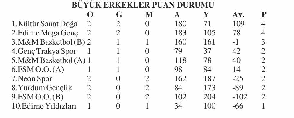 30 Kasım Pazar günü başlayan Edirne Büyük Erkekler Basketbol Ligi’ne12 Aralık 2025 Cuma günü 2 karşılaşma ile devam edilecek. Lig 29 Aralık 2025 tarihinde final maçı ile sona erecek.