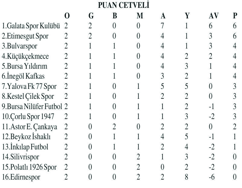 Galata Spor Kulübü ve Etimesgut Spor’un 2’de 2 yaparak puan cetvelinin ilk iki sırasında bulunduğu 1. Grup’ta Silivrispor, Polatlı 1926 Spor ve Edirnespor’un henüz puanı bulunmuyor.