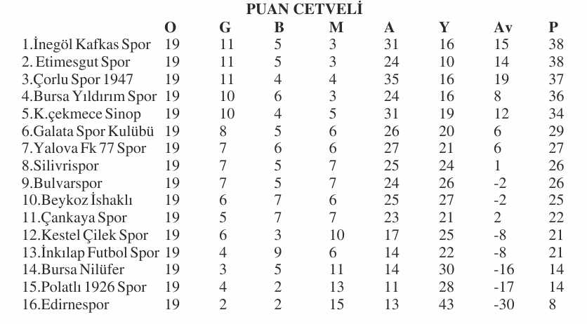 Bu arada haftaya lider olarak giren Karalar İnşaat Etimesgut Spor Kulübü evinde Kestel Çilek Spor Kulübü 1-1 berabere kalınca Küçükçekmece Sinop Spor A.Ş.’yi 2-1 yenen İnegöl Kafkas Spor Kulübü averajla yeniden liderliğe yükseldi.