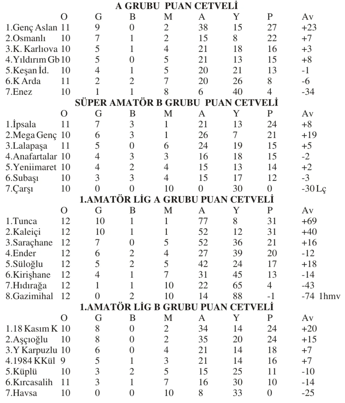 Süper Amatör Futbol Ligi A Grubu’nda Genç Aslanlar maç fazlasıyla 5 puan, B Grubu’nda da İpsala yine maç fazlasıyla 3 puan, 1. Amatör Futbol Ligi’nde A Grubu’nda Tuncaspor, B Grubu’nda ise 18 Kasım Kurtuluşspor averajla lider durumda bulunuyor.
