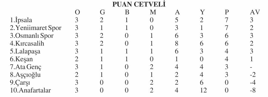 Ligin ilk 2 haftasında galip gelen tek takım olarak liderliğe yükselen Yeniimaret Spor Kulübü, Lalapaşaspor ile golsüz berabere kalıp 1 puanla yetinmek zorunda kalınca Ata Genç’i 2-1 yenip haftayı 3 puanla kapatan İpsalaspor averajla liderliğe yükseldi.