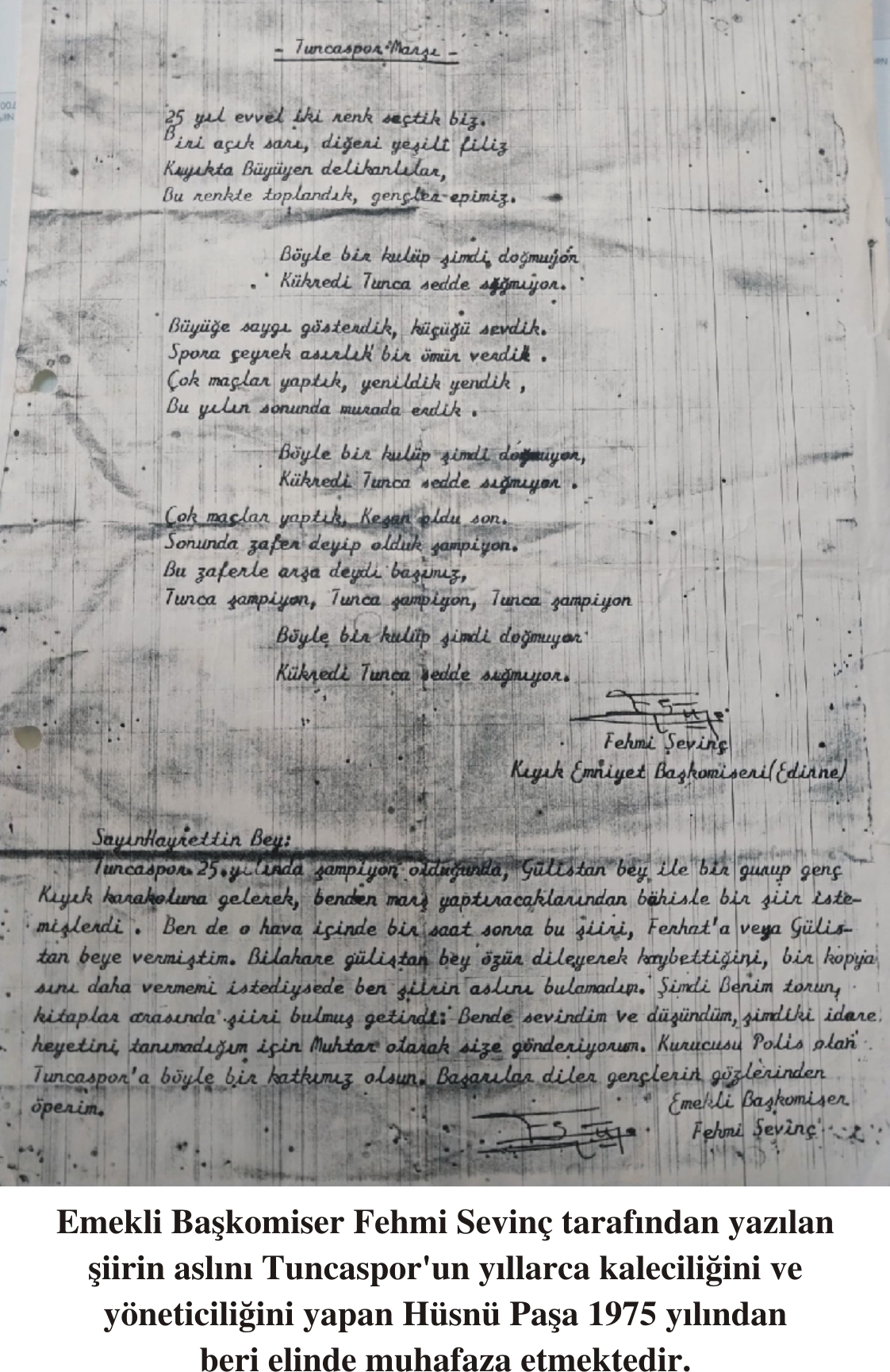 Bilahare Gülistan bey özür dileyerek kaybettiğini, bir kopyasını daha vermemi istediyse de ben şiirin aslını bulamadım. Şimdi benim torun kitaplar arasında şiiri bulmuş getirdi. Bende sevindim ve düşündüm, şimdilik idare heyetini tanımadığım için muhtar olarak size gönderiyorum. Kurucusu polis olan Tuncaspor’a katkımız olsun. Başarılar diler gençlerin gözlerinden öperim.