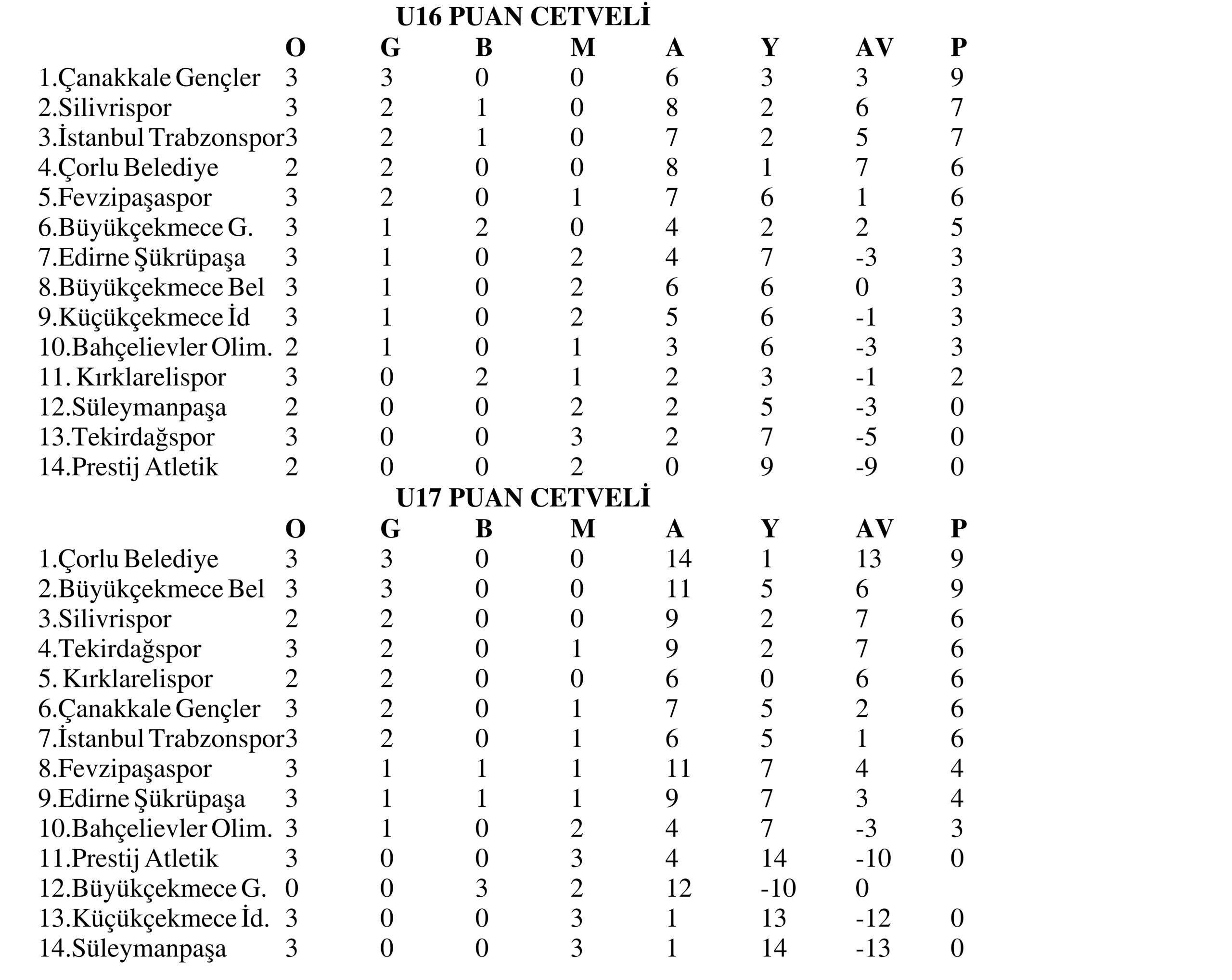 U17 GELİŞİM LİGİ 3.HAFTA TOPLU SONUÇLAR