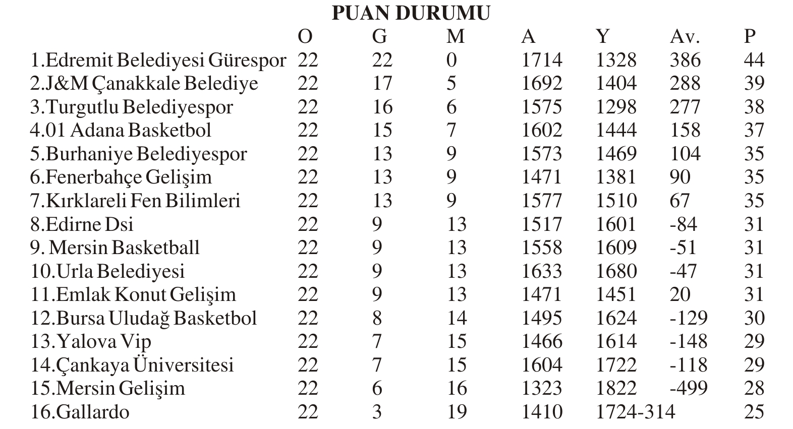 TKBL 22. HAFTA TOPLU SONUÇLAR