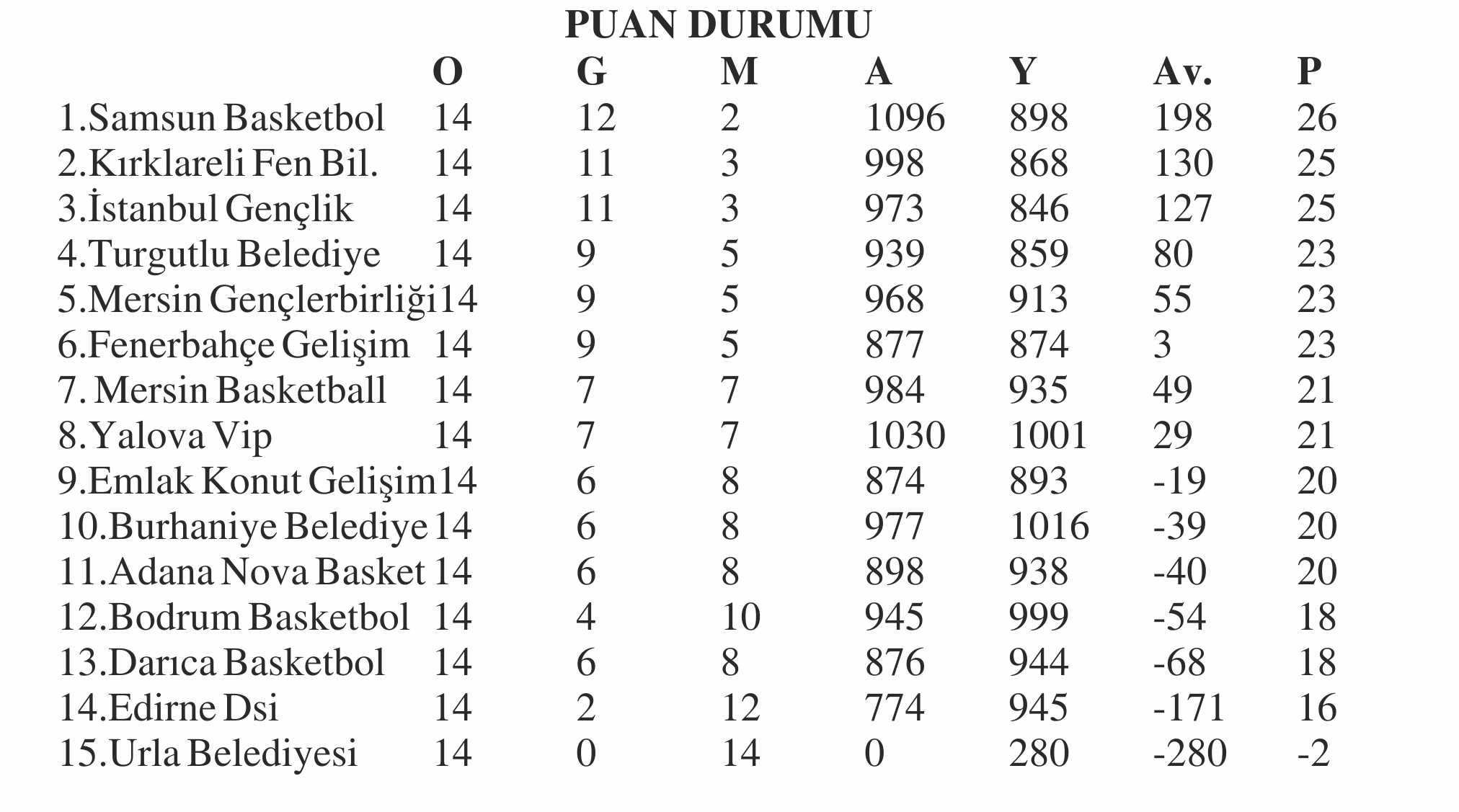 Türkiye Kadınlar Basketbol Ligi’nde (TKBL) 2025-2026 sezonunun ilk yarısını Zorlu Koleji Samsun Basketbol lider olarak tamamlarken, Edirne DSİ ise Urla Belediyesi’nin ligden çekilmesi nedeniyle son sırada tamamlamış oldu.
