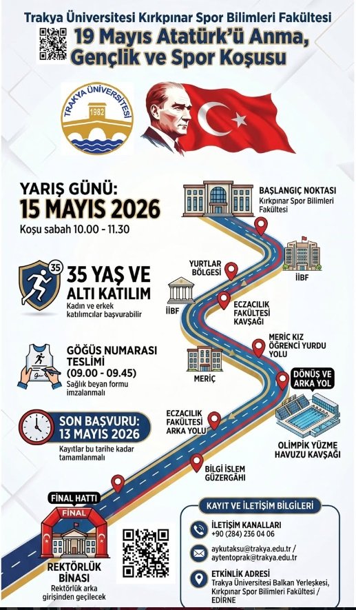 Trakya Üniversitesi Kırkpınar Spor Bilimleri Fakültesi tarafından düzenlenen "19 Mayıs Atatürk’ü Anma, Gençlik ve Spor Koşusu" 15 Mayıs 2026 Cuma günü gerçekleştirilecek…