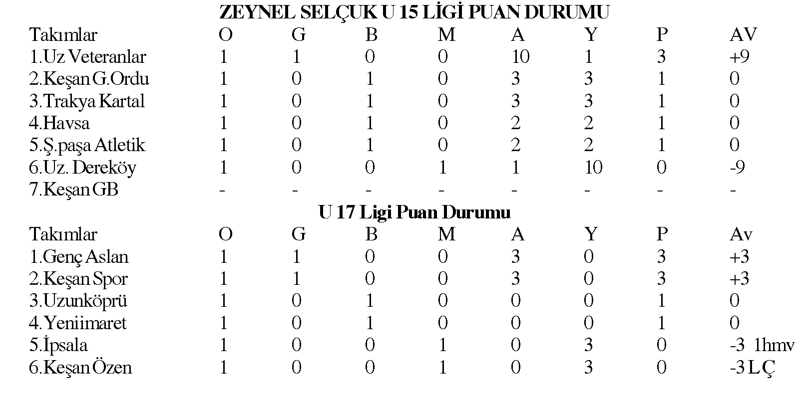 U15 LİGİ İLK HAFTA TOPLU SONUÇLAR
