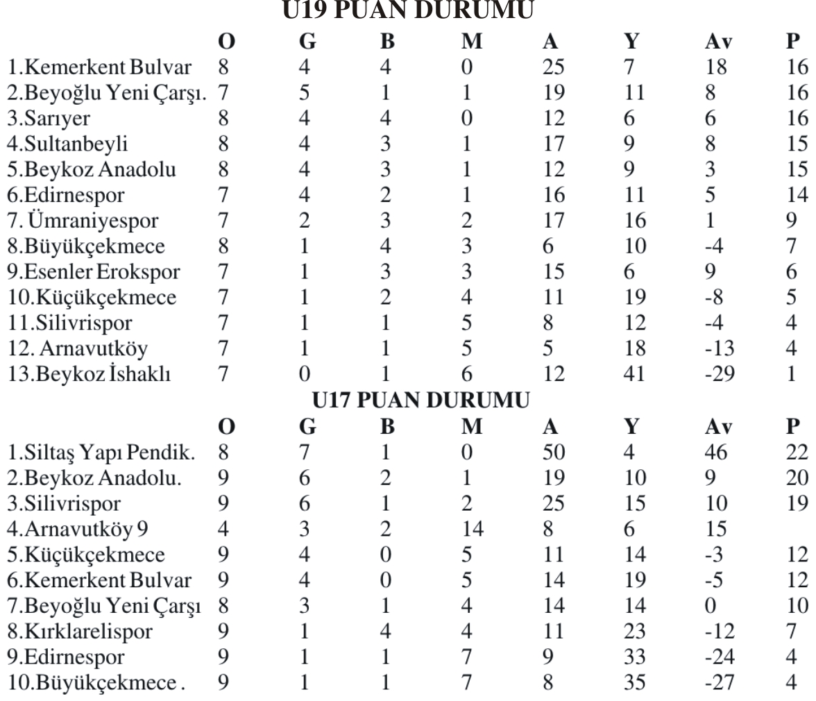 U19 1. GRUP 8. HAFTA TOPLU SONUÇLAR