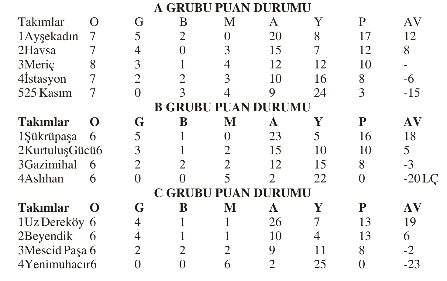 C.Grubu’nda ise şampiyon olan Dereköyspor, Yenimuhacır’ı 6-0 yenerek ipi göğüsledi. Beyendik spor ile Mescidpaşa arasında oynanan play-off mücadelesinde Beyendikspor, 4-0’lık skorla galip gelerek play-off oynamaya hak kazandı. Karşılaşma sonrası Uz. Dereköy’ün kupası takdim edildi.