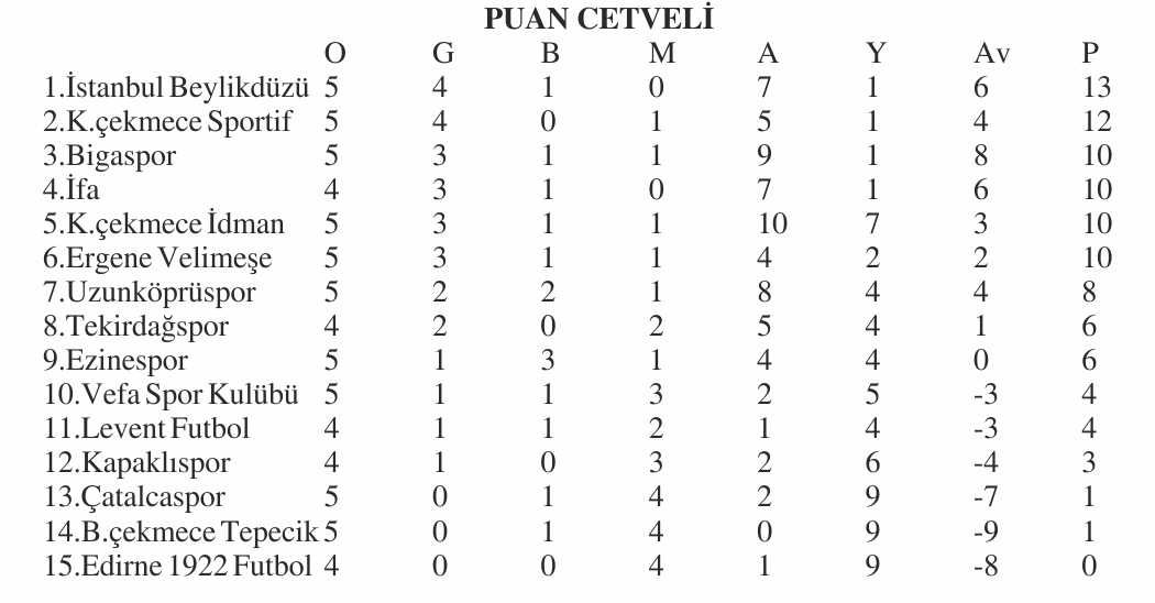 Bölgesel Amatör Lig (BAL) 10. Grup’ta 5. hafta perdesi Çarşamba günü oynanan maçlarla kapanırken, geçen hafta Tekirdağspor’u deplasmanda 2-0 yenen Uzunköprüspor bu kez evinde Levent Futbol Spor’u 3-0 yenerek puanını 8’e çıkardı.